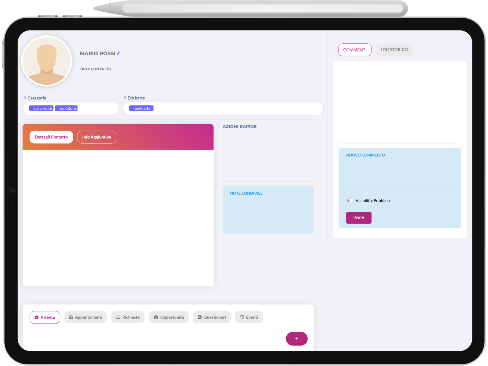 Tieni traccia di tutte le Attività svolte sul Contatto. Ti bastano 2 click/tap per tenere tutto registrato e puoi anche allegare dei commenti rapidi.